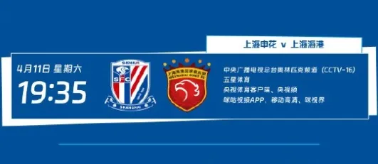 虎扑04月09日讯 中超官方公布第5轮转播计划,CCTV16转播上海申花与上海海港的上海德比,CCTV5+转播北京国安vs成都蓉城。